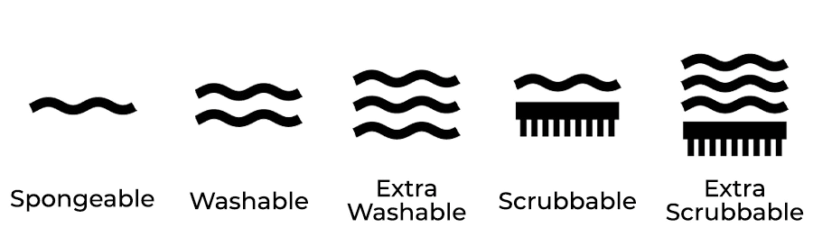 Scrubbable: A Scrubbable paper is more durable than washable and has a symbol with one wavy line and a scrubbing brush. Can be cleaned with a sponge, cloth or gentle brush using water or mild detergents. Remember it is still paper and too much pressure or too harsh a chemical cleaner will result in damage to the paper. Oil and fat stains will still be hard to remove even if worked on immediately.