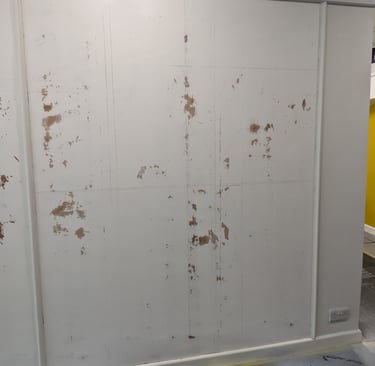 This image is of a training wall at the Dulux Academy and it shows the typical type of damage that can be done to a wall when removing wallpaper with a scraper.