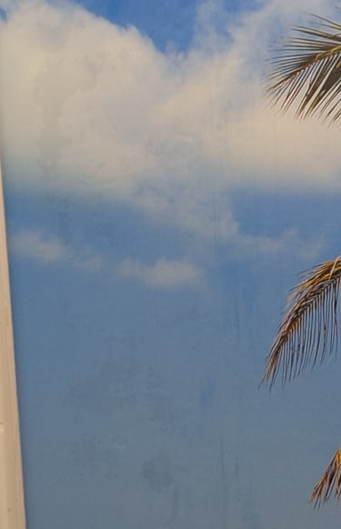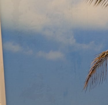 Using that damaged wall we saw earlier and putting some paper on it directly is not the best idea as you can see from these pictures. The image of the sky and clouds on the is of a mural paper that was quite thick that has been hung on this wall. At first glance it looks great but ... If you look closely at the left hand side of the clouds and the wall below them you can see the damage on the wall underneath showing through and looking like a "map" texture in exactly the pattern of damage in the left hand side of the photo of the damaged wall.